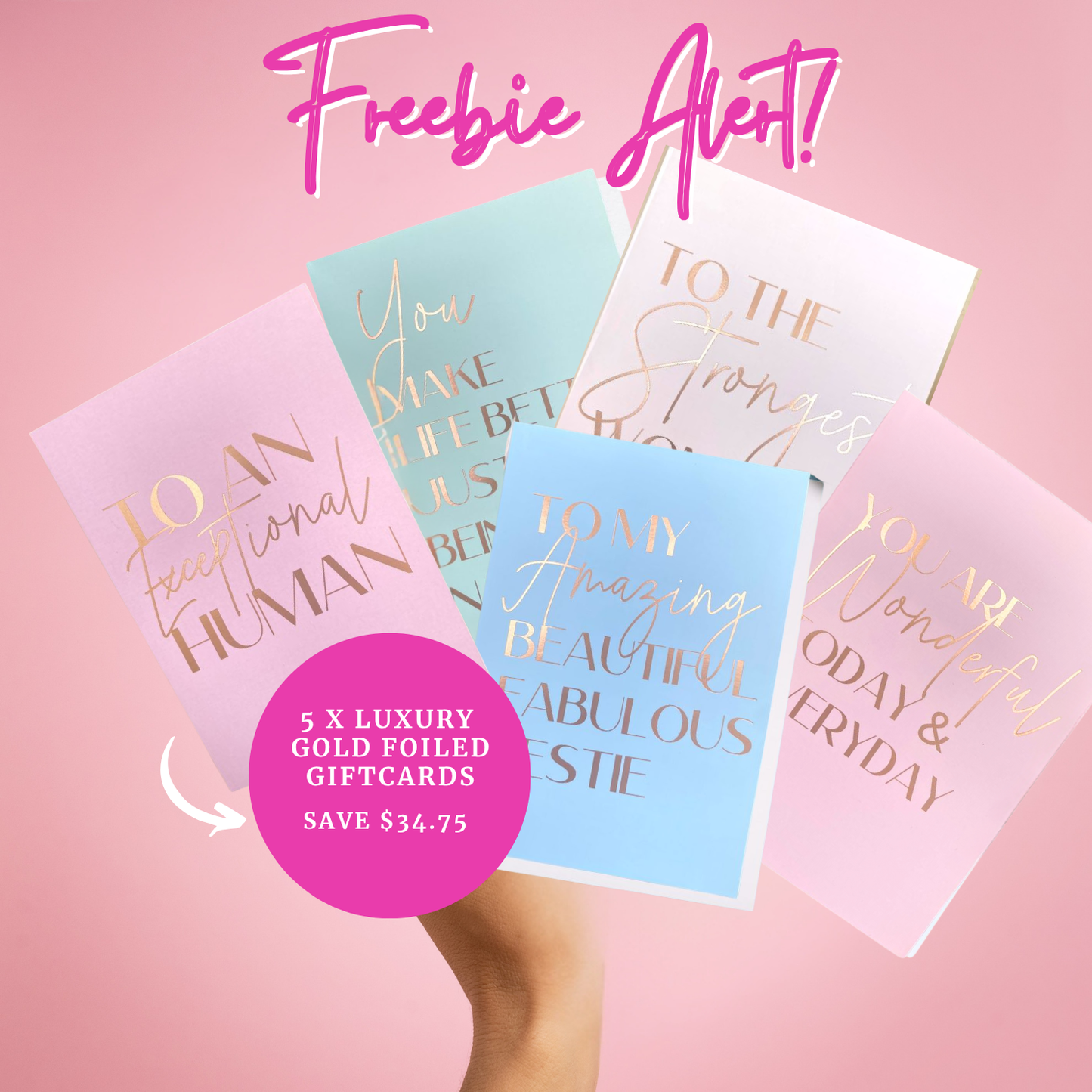 Treat yourself to 5 deluxe gold foiled gift cards when you spend $200 or more. Valued at $34.75